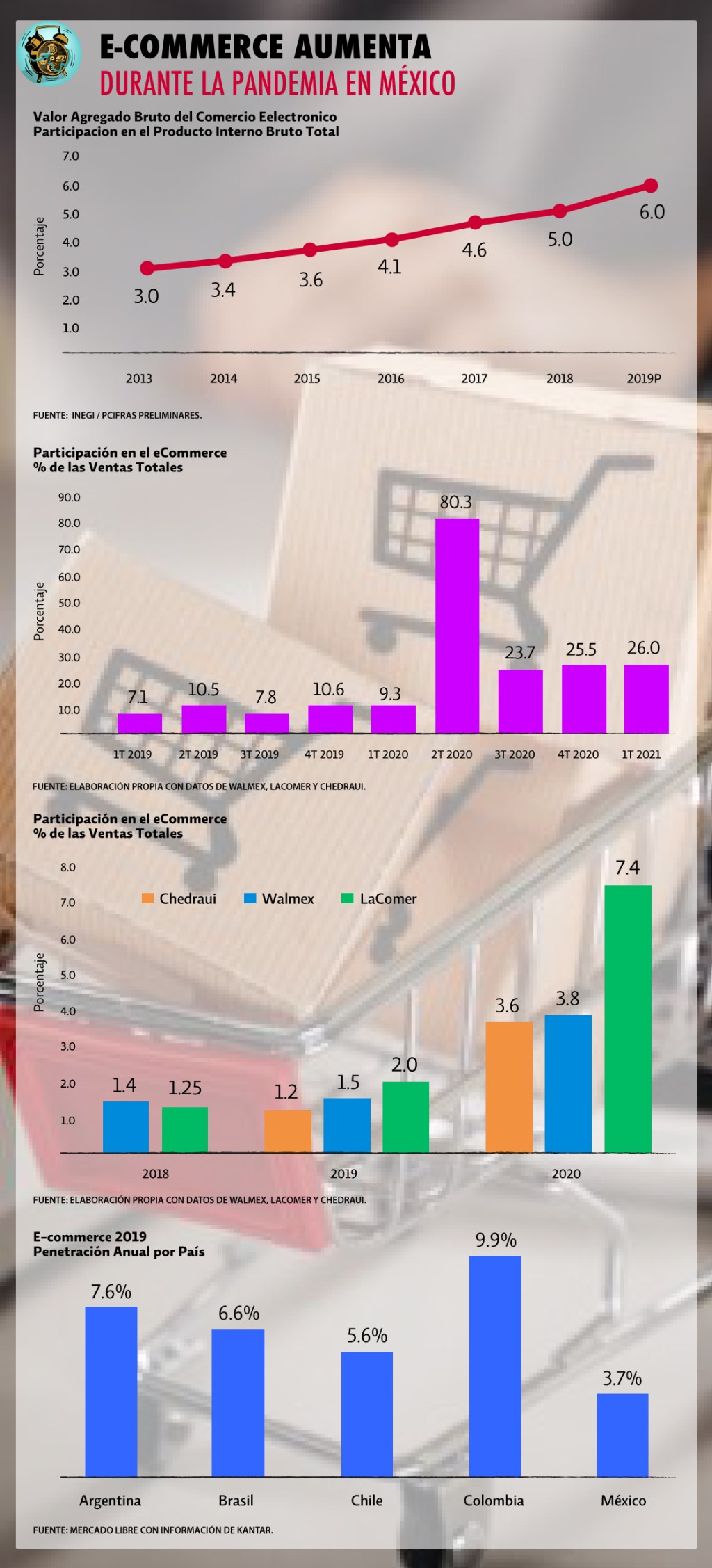 Las ventas por medios digitales ya mostraban un crecimiento consistente antes del año de confinamiento. Según INEGI, en 2019 el comercio electrónico ya representaba un 6% del Producto Interno Bruto Total.