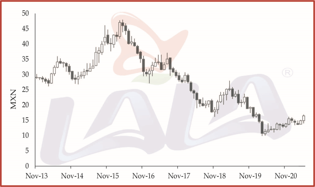 La cotización de Lala ha sido fuertemente castigada desde su listado en 2013. Actualmente, la acción cotiza alrededor de los 16 pesos, es decir, un 50% por debajo de su precio de colocación. A pesar de este castigo en el precio de la acción, el precio Ratio precio-utilidad (P/U) o el P/E (por sus siglas en inglés), el cual se obtiene dividiendo el precio por acción entre el Beneficio Por Acción (BPA), se encuentra para marzo de este año en 69.99 pesos. Mientras que el del mercado accionario mexicano se ubica en apenas 15.57 pesos, lo que sugiere una valuación alta para esta acción.