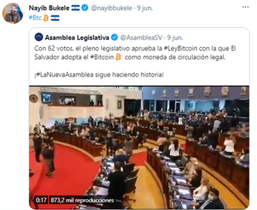 La ley Bitcoin fue aprobada con 62 votos por la Asamblea Legislativa de El Salvador. “Con el objetivo de generar oportunidades de empleo, promover una verdadera inclusión financiera y generar dinamismo económico, los diputados de la Asamblea Legislativa aprobaron la Ley Bitcoin”, explica el comunicado de la Asamblea Legislativa del 9 de junio del 2021.