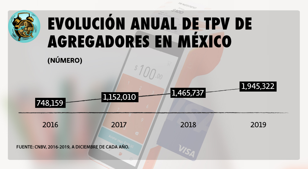 Un agregador de pagos es una empresa que participa en la Red de Pagos con Tarjetas, ofreciendo el servicio y la infraestructura de las TPV para aceptar pagos con tarjetas. Los principales participantes de este mercado son Clip, Zettle Go, Sr. Pago, BilliPocket, Quibo, NetPay y SiHayPagos.