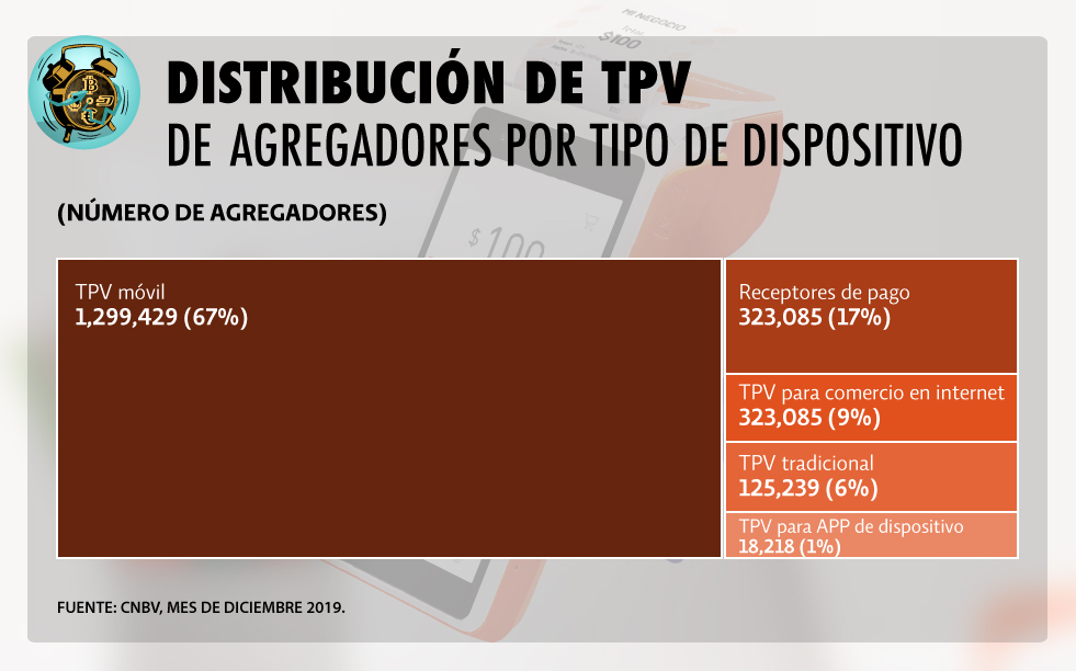 Según el último Informe de Inclusión Financiera de la Comisión Nacional Bancaria y de Valores en México había 3 millones 264 mil 750 Terminales Punto de Venta (TPV), de las cuales el 40% de los dispositivos corresponden a la banca y entidades de ahorro y crédito popular y el 60% dispositivos fueron TPV móviles.