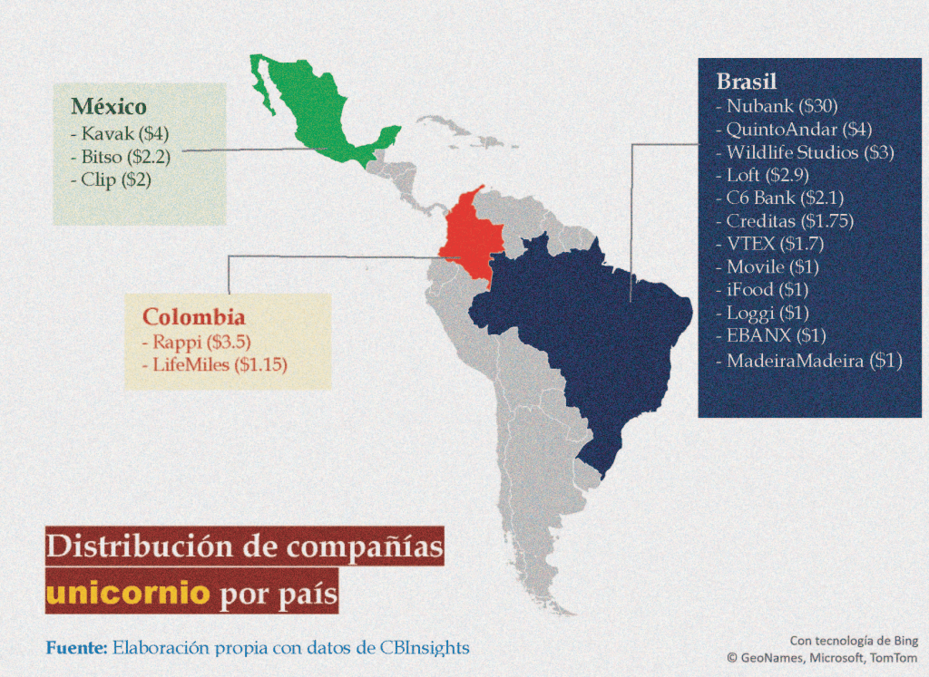 En América Latina hemos visto surgir 17 de 708 unicornios que se cuentan a nivel mundial en la lista de CBInsights de junio del 2021. Según la empresa de análisis son 3 países en América Latina que han dado origen a startups unicornio: Brasil, México y Colombia, con doce, tres y dos empresas respectivamente, acumulando un capital de 63.3 mil millones de dólares.