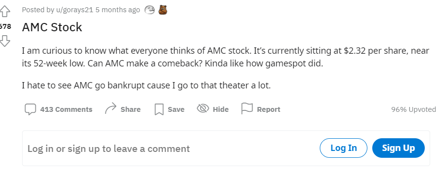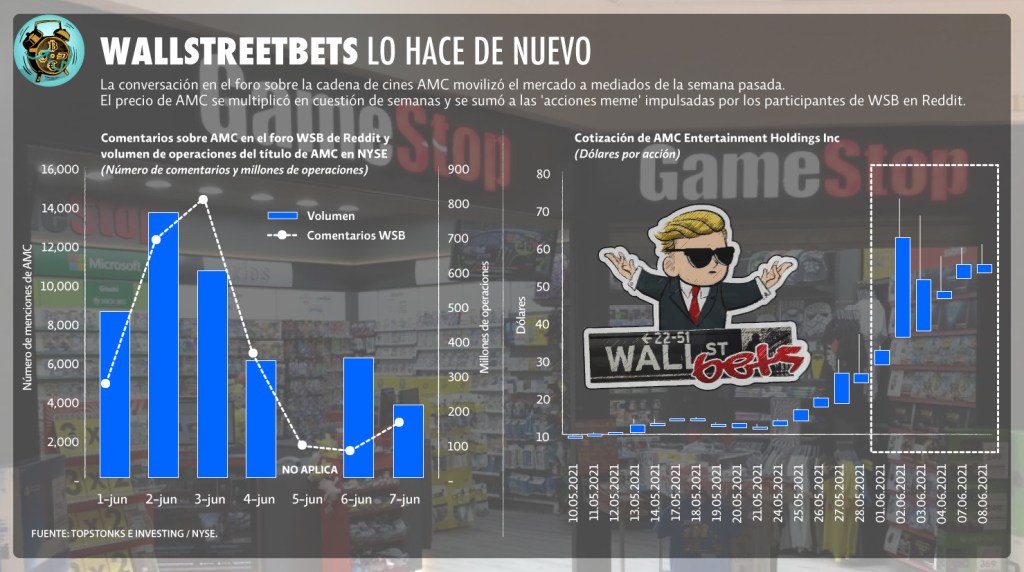 Los primeros pasos de AMC en el foro de Reddit, WallStreetBets, fueron hace 5 meses cuando un usuario mencionaba el reducido precio de la acción y se cuestionaba si la compañía podría recuperarse, «odiaría ver AMC ir a la quiebra porque voy mucho al cine», comentó.