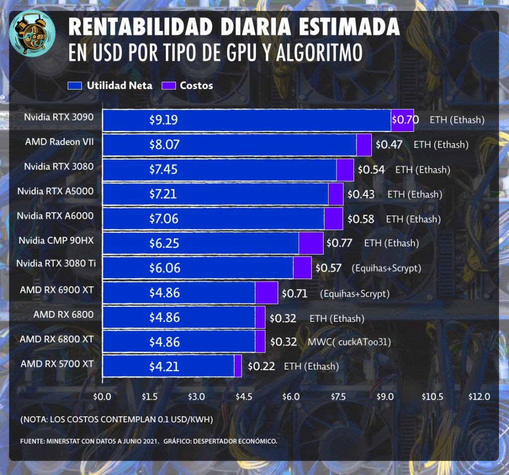 Otra opción, es la AMD Radeon RX 6900 XT, el precio para mayo de 2021 fue de 2,389 dólares, ofreciendo una utilidad neta diaria de 4.86 dólares.