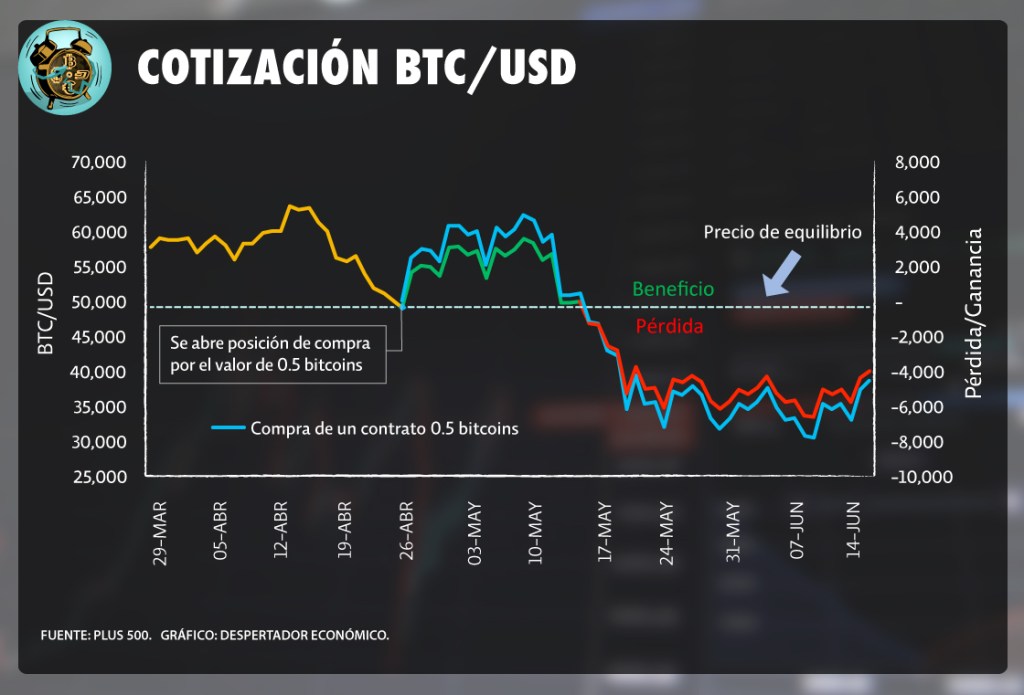 Es decir, el contrato se pacta considerando el precio vigente del activo – Bitcoin cotiza en 40,297.80 dólares – el 2 de agosto del 2021 – y al final del periodo se acuerda es pagar la diferencia entre el precio fijado en el contrato y el precio al día del vencimiento.