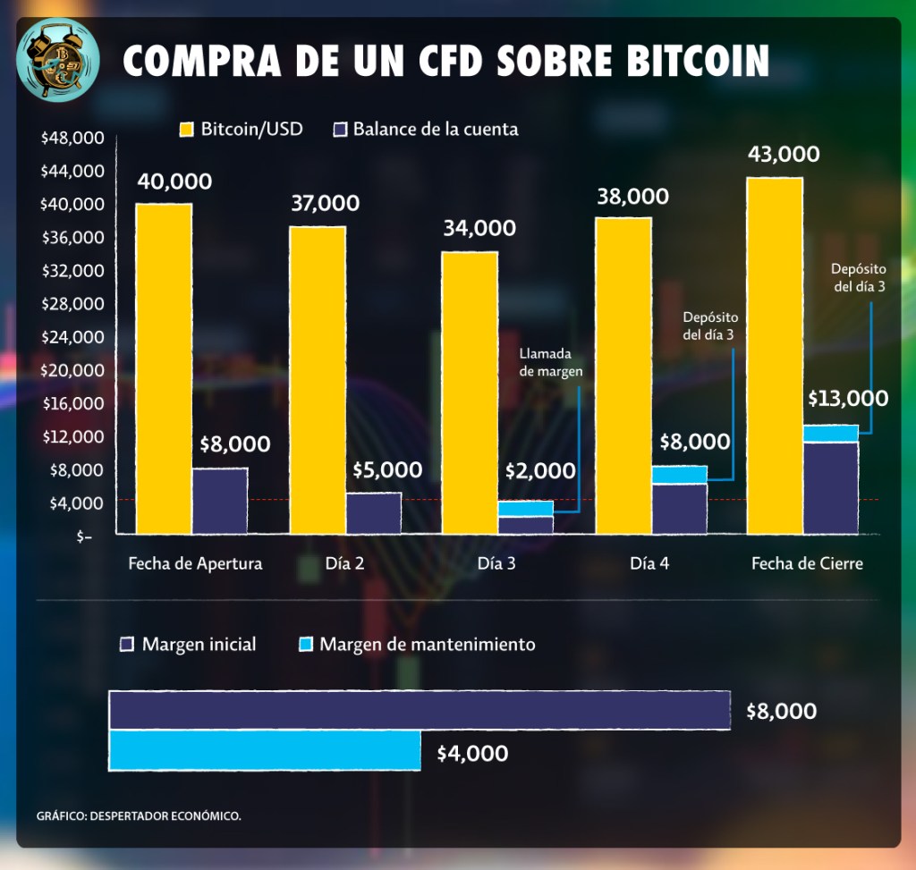 Imaginemos que pactas un CFD de Bitcoin por 40 mil dólares, esperando que el precio suba en los próximos días. El margen inicial para abrir una posición larga – expectativa alcista – será de 20% sobre la cotización de Bitcoin. Es decir, la apertura de una posición larga en un CFD sobre Bitcoin sería de 8 mil dólares.