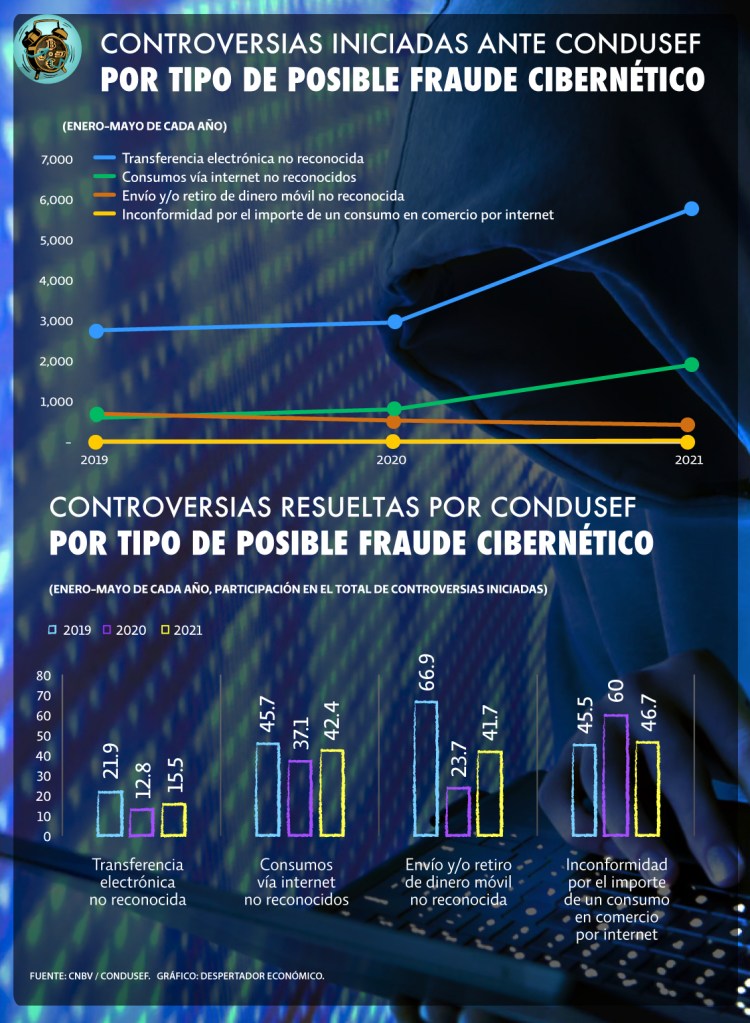 Los usuarios del sistema financiero levantaron 8 mil 102 quejas por fraudes cibernéticos en el transcurso del 2021, como transferencias electrónicas o consumos por internet no reconocidos. Este tipo de siniestros representan el 31.3% de los de las controversias presentadas ante la Condusef por posible fraude bancario.