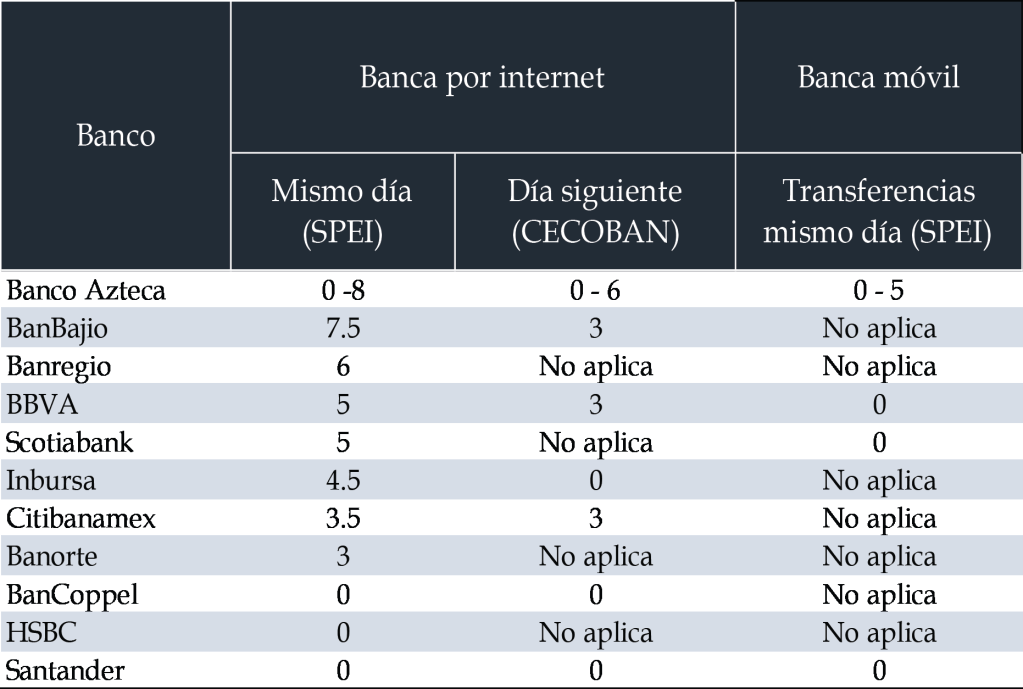 En transferencias hechas el mismo día en Banca por internet los bancos que cobran la comisión más alta son Banco Azteca, cuya comisión va de los 0.00 a los 8.00 pesos, BanBanjío con 7.50 pesos y Banregio con una comisión de 6.00 pesos.