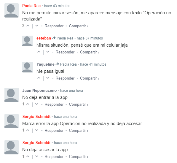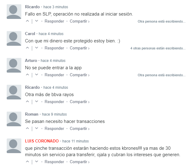 Los primeros comentarios se hicieron aproximadamente a las 16:30 horas, señalaban que no se podía entrar a la app, por lo menos 30 minutos antes de los reportes; añadían que el token para realizar trámites en la página web no funcionaba correctamente.
