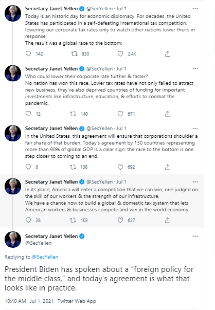 El 6 de julio, en un comunicado de prensa del Departamento del Tesoro se anunció que Janet Yellen, secretaria del Departamento del Tesoro, se reunió con Margrethe Vestager, vicepresidenta ejecutiva en la Unión Europea.