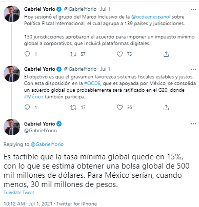 En el caso de México, Gabriel Yorio, subsecretario de la Secretaría de Hacienda y Crédito Público, a través de un tuit dijo: “Es factible que la tasa mínima global quede en 15%, con lo que se estima obtener una bolsa global de 500 mil millones de dólares. Para México serían, cuando menos, 30 mil millones de pesos”.