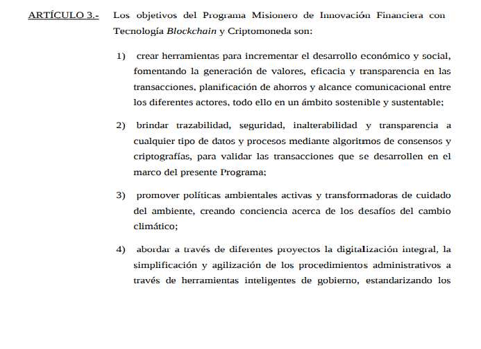 La Secretaría de Hacienda de la provincia de Misiones, Argentina, anunció la aprobación del Programa Misionero de Innovación Financiera con Tecnología Blockchain y Criptomonedas por la Cámara de Diputados de la provincia de Misión. Es la primera provincia que crea un marco normativo para el desarrollo de estas tecnologías.