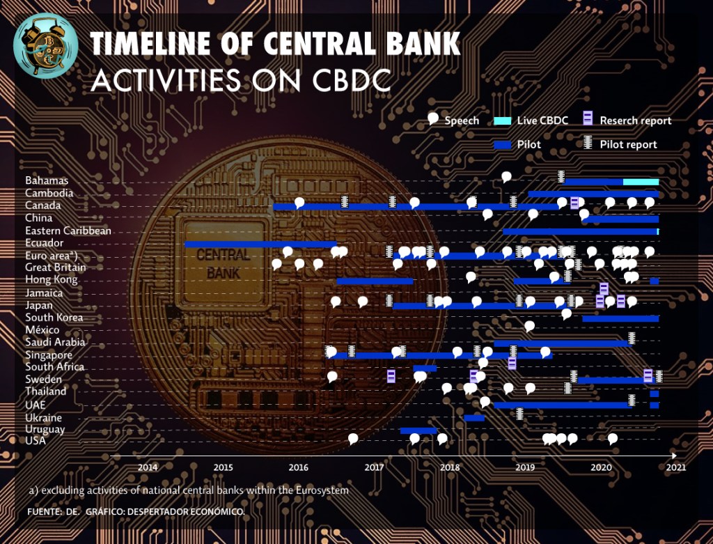 Actualmente las CBDC aún están en fase de desarrollo en el mundo cada vez más bancos se están planteando su uso, uno de los principales es el caso de China en el que su versión, el Yuan Digital Chino el cuál lleva dos años en desarrollo por parte del Banco Popular de China en conjunto con compañías privadas como Apple Pay China, AliPay y WeChat.