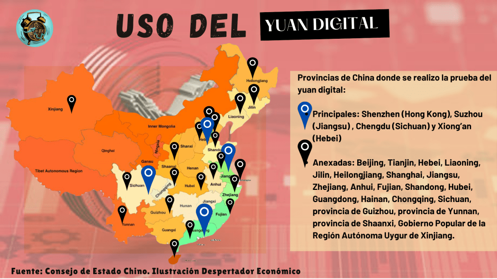 En abril de 2020, China comenzó a probar el yuan digital en cuatro ciudades, Shenzhen, Suzhou, Chengdu y Xiong’an, para mejorar la funcionalidad de la moneda, a través del “Programa piloto de profundización integral para la innovación y el desarrollo del comercio de servicios”.