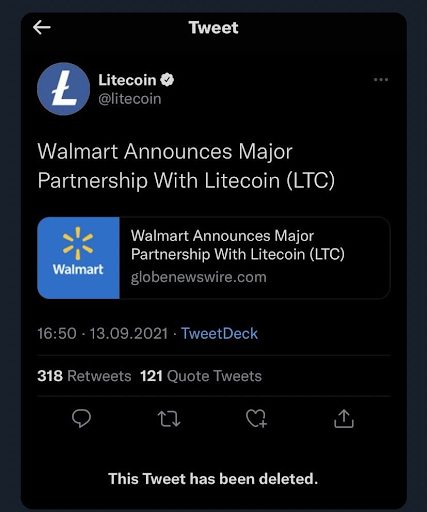 A primeras horas de este lunes 13 de septiembre, la agencia de noticias Globe Newswire compartió una nota asegurando que Walmart empezaría a aceptar pagos con la criptomoneda Litecoin, noticia que fue desmentida poco tiempo después.