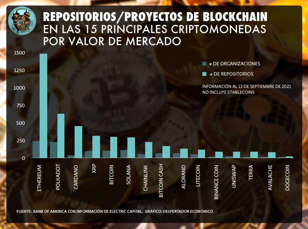 Los 15 activos digitales más valiosos por capitalización de mercado han desarrollado más de 4,000 proyectos diferentes, de acuerdo con el el estudio Digital Assets Primer: Only the First Inning, Bank of America. El estudio muestra que Ethereum, Polkadot, Solana, XRP y Bitcoin son los activos digitales con más proyectos y repositorios.
