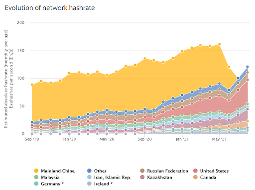El hashrate de China, quien mantuvo la posición como el país líder en minería desde que la Universidad de Cambridge comenzó el registro en 2019, se desplomó a raíz de las prohibiciones que el gobierno impuso a la actividad criptográfica. Las cifras más recientes de Cambridge revelan que el promedio de hashrate global de China cayó a cero, cuando antes de la prohibición mantenía 49.06% del total del poder de minado mundial.