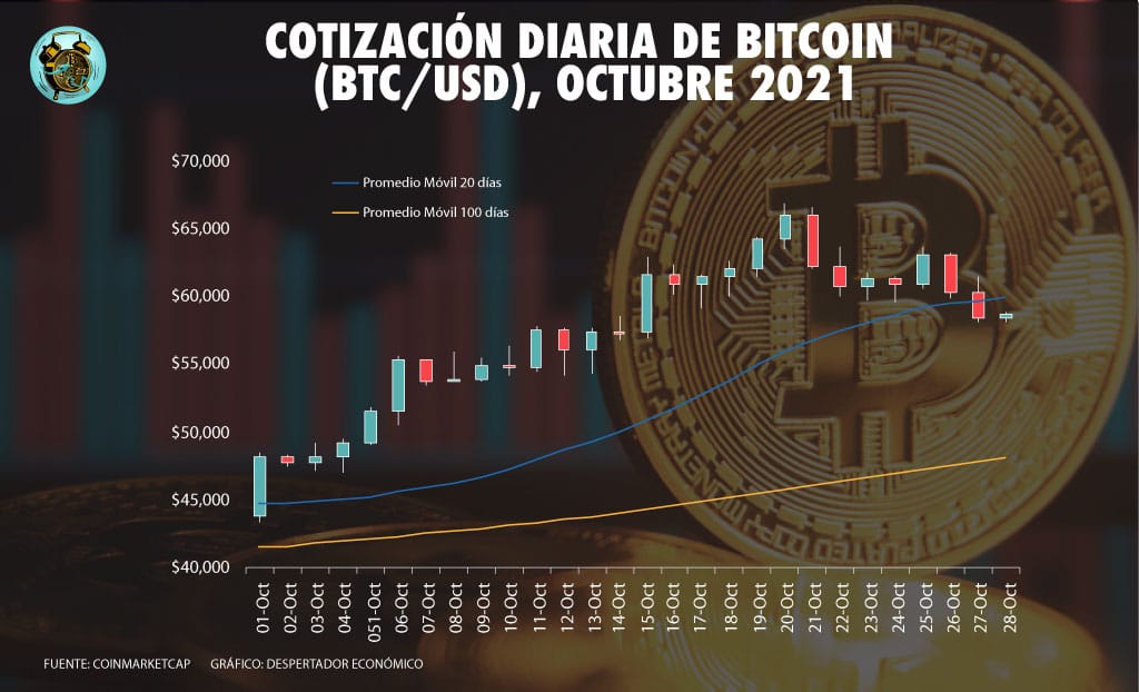 Bitcoin cotizó debajo de 59,000 dólares desde la madrugada del 27 de octubre, luego de descender 2,300 dólares en 50 minutos después de las 2:09 hora de la ciudad de México (GMT-6). Este nuevo descalabro se suma al proceso de corrección que comenzó después de que la criptomoneda de referencia llegó a cambiarse por casi 67,000 dólares hace una semana —miércoles 21 de octubre—, acumulando una contracción de 8.66% en en siete días.