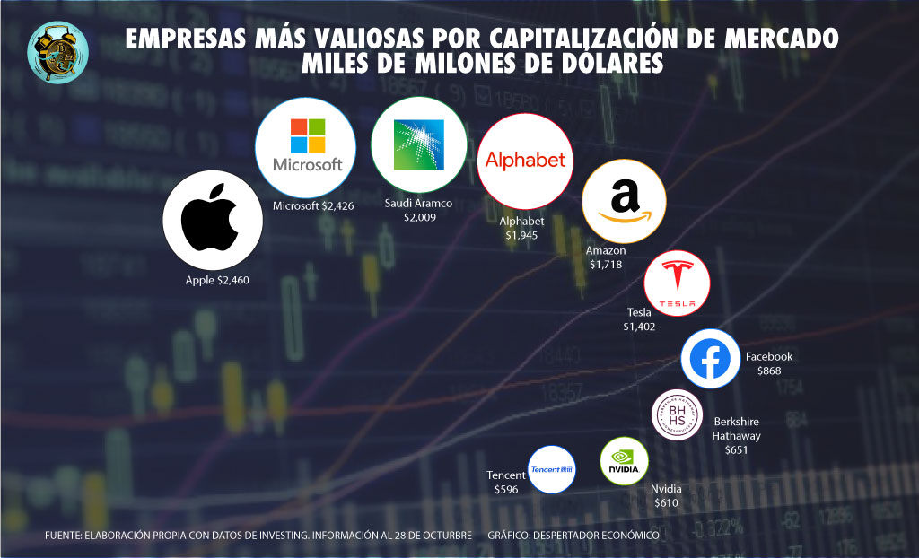 Al cierre de la jornada del 28 de octubre Microsoft las acciones de Microsoft cotizaban en 324 dólares por acción, mientras que Apple cerró la sesión con un precio de 152 dólares por acción. Considerando el conjunto de las acciones que representan la propiedad de las grandes tecnológicas, el valor de capitalización de mercado de Apple asciende a 2.46 billones de dólares, mientras que Microsoft está valuada en 2.43 billones de dólares; un margen que acerca a Microsoft a ser la compañía más valiosa del mundo por tercera vez en su historia.